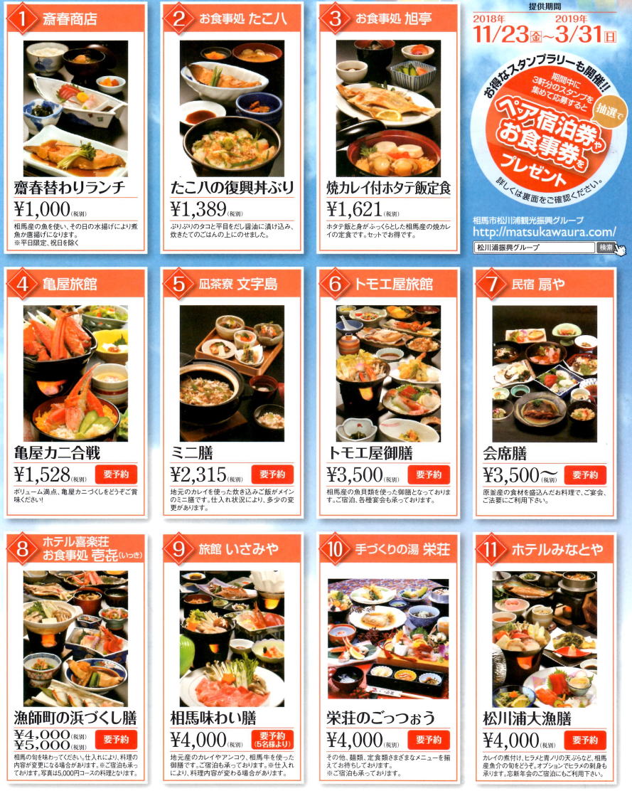 ■ スタンプラリーについて ■ ・スタンプラリー開催期間「2018年11月23日〜2019年3月31日」 ・期間中にスタンプを3軒分集めて応募すると、 抽選でペア宿泊券(10組)お食事券(50組)をプレゼント! ・スタンプを3つ集めたら、お店の人に氏名等を書き入れ渡して下さい。 ・スタンプラリー用紙はコチラからダウンロード出来ます。 ※当選者発表は商品の発送をもってかえさせて頂きます。 復興チャレンジグルメは安全が確認された食材のみを使用し提供ております。 |